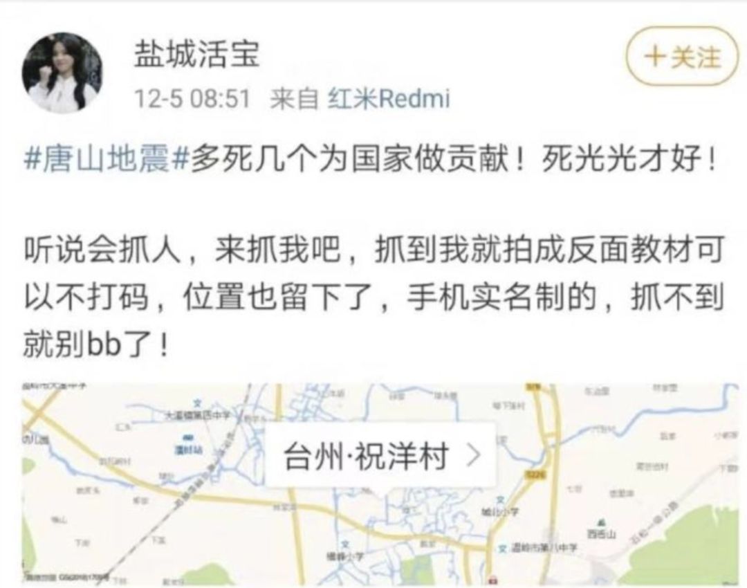 “唐山地震多死几个?”男子发不当言论还留定位求抓…果断逮捕!