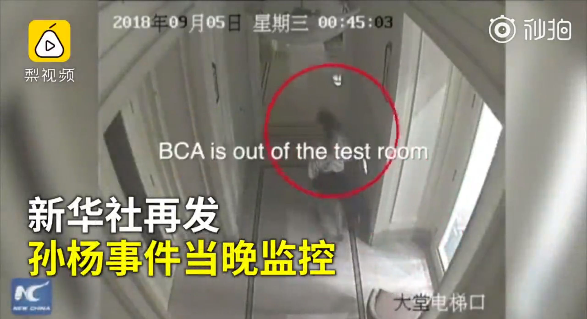 新华社再发孙杨药检当晚的视频,镜头中血样采集助理(BCA)离开检测房间,她并没有带走血检样本。随后兴奋剂检查官(DCO)也离开了房间,没有人看管血检样本。检查官在门口来回走动。新华社质疑道:“如果监管样本的过程本身就不完整,那这个检测结果是否有效呢?”