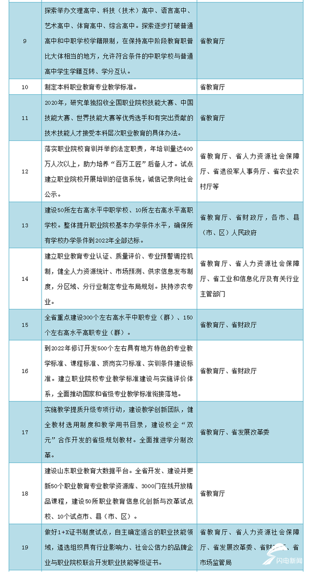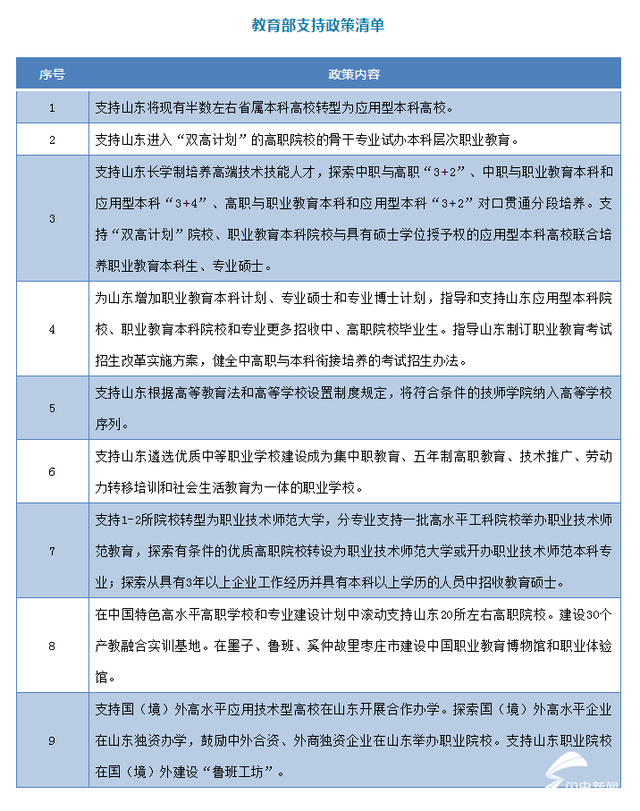 未来,教育部将通过支持山东半数左右的省属本科高校转型为应用本科高校、进入“双高计划”(中国特色高水平高职院校和专业建设计划)的高职院校骨干专业试办本科层次职业教育、支持山东建设30个产业融合实训基地等具体举措,推动职业教育提质培优,为国家职业教育改革提供支撑。