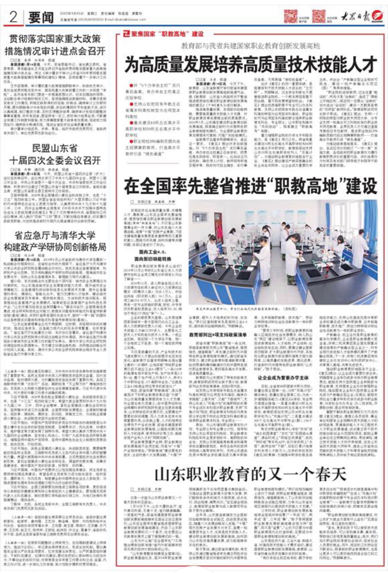 近年来,山东接连被确定为全国新旧动能转换综合试验区、自由贸易试验区。随着八大发展战略深入实施,“十强”现代优势产业集团发展方兴未艾,亟需一批高素质专业人才,尤其是技术技能人才。建设职业教育创新发展新高地,如何助力山东经济高质量发展,成为新闻媒体关注的焦点。
