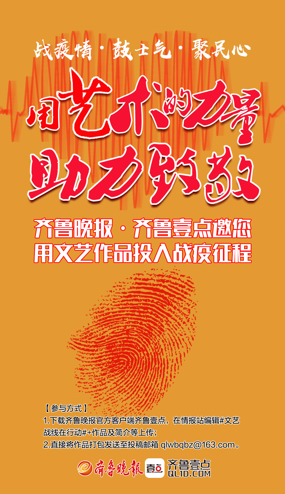与此同时,齐鲁晚报·齐鲁壹点面向社会征集优秀战疫公益文艺作品,您可以将自己的作品发送至齐鲁晚报官方客户端齐鲁壹点情报站, 优秀作品将在齐鲁晚报·齐鲁壹点进行集中展示,欢迎广大文艺工作者和壹粉踊跃投稿。
