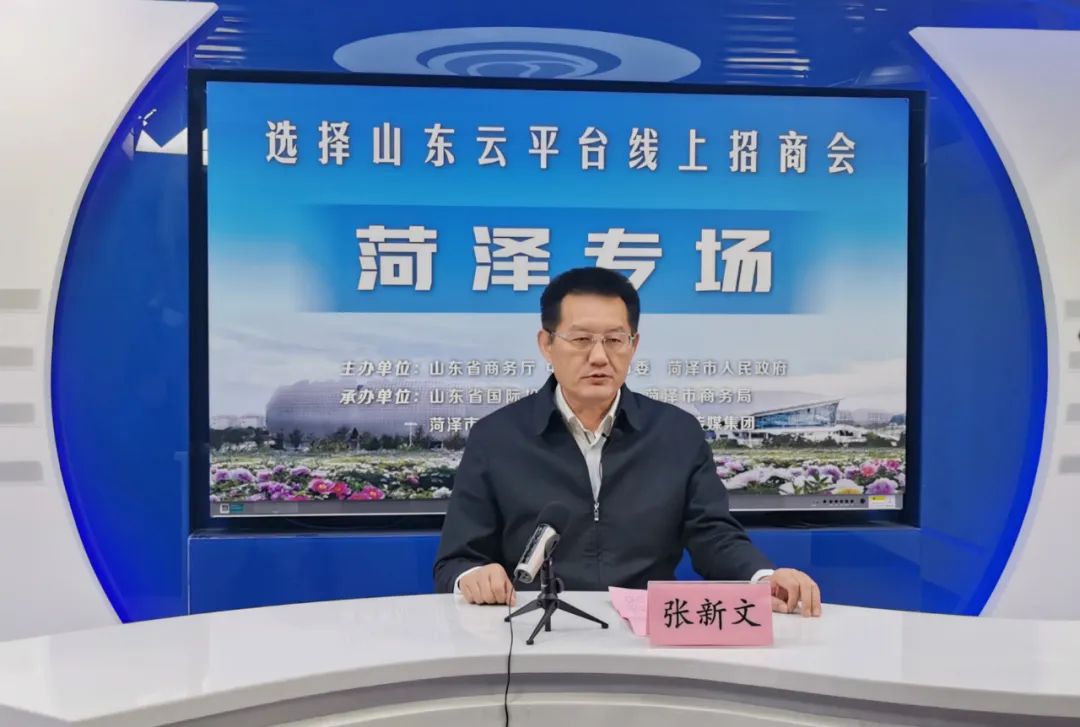 4月1日,“选择山东”云平台线上招商会——菏泽专场举行,菏泽市委书记张新文通过云招商智能系统视频直播推介菏泽营商环境,向投资商发出邀请。