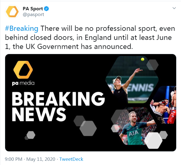 据英国新闻联合社报道,英国政府宣布允许在空场情况下进行文化/体育活动,但至少在6月1日前英国不会举办任何职业体育比赛。
