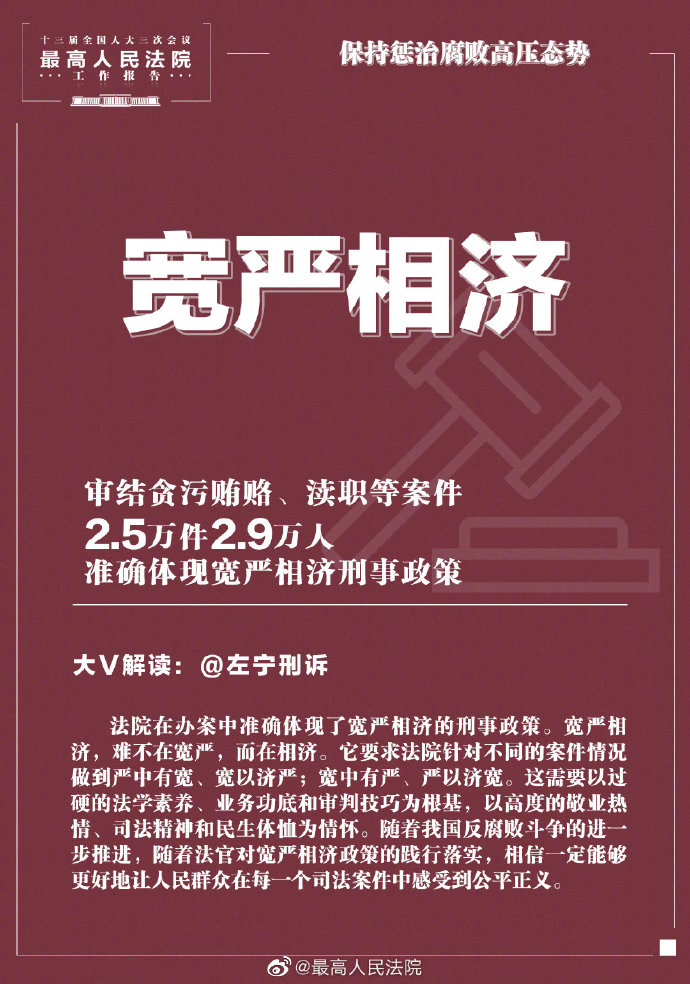 最高人民法院:保持惩治腐败高压态势,决不让腐败分子逍遥法外 @最高人民法院 2020-05-25 2689 5月25日下午,十三届全国人大三次会议在人民大会堂举行第二次全体会议,听取最高人民法院院长周强关于最高人民法院工作的报告。 报告提到,审结贪污贿赂、渎职等案件2.5万件2.9万人。积极配合境外追逃追赃,决不让腐败分子逍遥法外、逃避惩罚。 (@最高人民法院) 责任编辑:孙远明