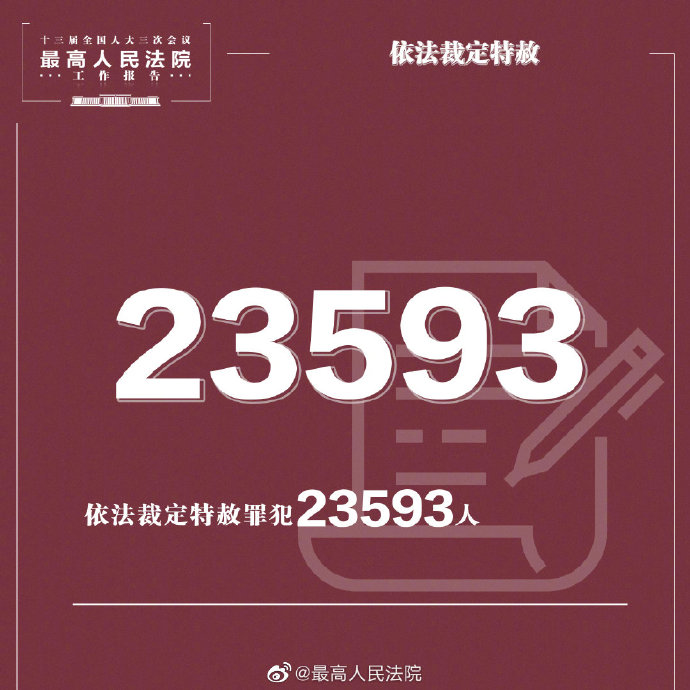新中国成立70周年前夕,依法裁定特赦罪犯23593人 @最高人民法院 2020-05-25 1.3万 5月25日下午,十三届全国人大三次会议在人民大会堂举行第二次全体会议,听取最高人民法院院长周强关于最高人民法院工作的报告。 报告提到,认真落实习近平主席特赦令和全国人大常委会特赦决定,在新中国成立70周年前夕,依法裁定特赦罪犯23593人,彰显了党和国家法安天下、德润人心的仁政。 (@最高人民法院) 责任编辑:孙远明