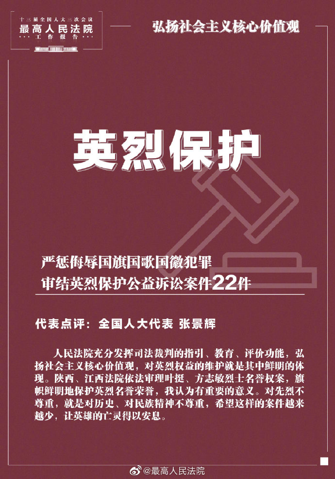 最高人民法院:保护英烈,严惩侮辱国旗国徽国歌犯罪 @最高人民法院 2020-05-25 2235 5月25日下午,十三届全国人大三次会议在人民大会堂举行第二次全体会议,听取最高人民法院院长周强关于最高人民法院工作的报告。 报告提高,弘扬社会主义核心价值观。严惩侮辱国旗国徽国歌犯罪,对侵害方志敏等英烈权益行为,严肃追究责任,旗帜鲜明捍卫英烈荣光。 (@最高人民法院) 责任编辑:孙远明