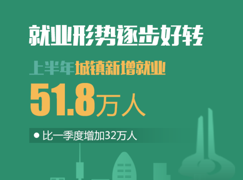 上半年,城镇新增就业51.8万人,比一季度增加32万人。6月末,城镇登记失业率为3.0%,同比下降0.23个百分点。上半年,全省居民人均可支配收入16468元,同比增长1.9%,比一季度提高1.2个百分点。
