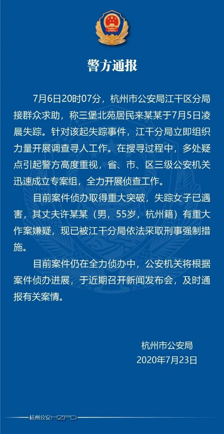 警方通报!杭州失踪女子遇害,丈夫有重大作案嫌疑已被控制