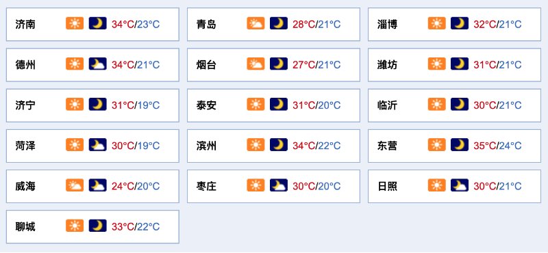 最高气温:鲁西北地区34℃左右,半岛沿海地区27℃左右,其他地区30℃左右。