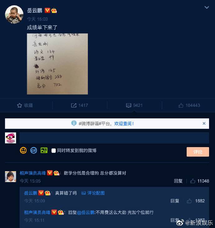 7月23日,2020全国高考成绩开始放榜,岳云鹏也“凑热闹”在微博晒出自己手写的高考成绩单,并发文:“成绩单下来了”。照片中岳云鹏写下自己的本名“岳龙刚”,并为自己打成绩:语文134分、数学99分、外语145分、理综288分,总分本应该是666分,但他却给自己写上了总分702分。随后相声演员高峰在评论区调侃道:“数学分低是合理的,总分都没算对”。岳云鹏疑问回应:“真算错了吗?”还配上计算器的截图,搞笑十足。