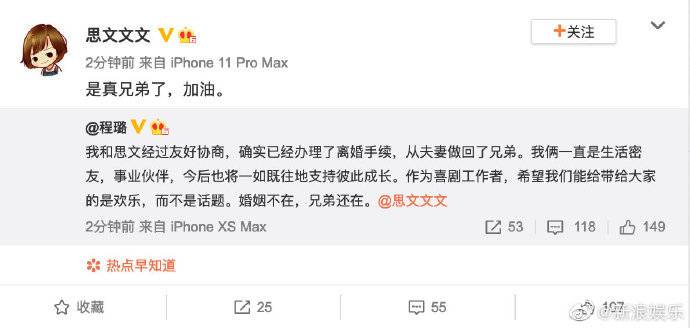 23日,有网友称在民政局门口看到思文程璐 ,两人疑似在办理离婚。不久,程璐在微博发文宣布两人已经离婚,他写道:“我和思文经过友好协商,确实已经办理了离婚手续,从夫妻做回了兄弟。”并表示今后将一如既往地支持彼此成长。“婚姻不在,兄弟还在。”思文则转发表示:“是真兄弟了,加油。”