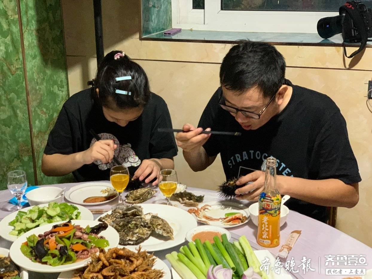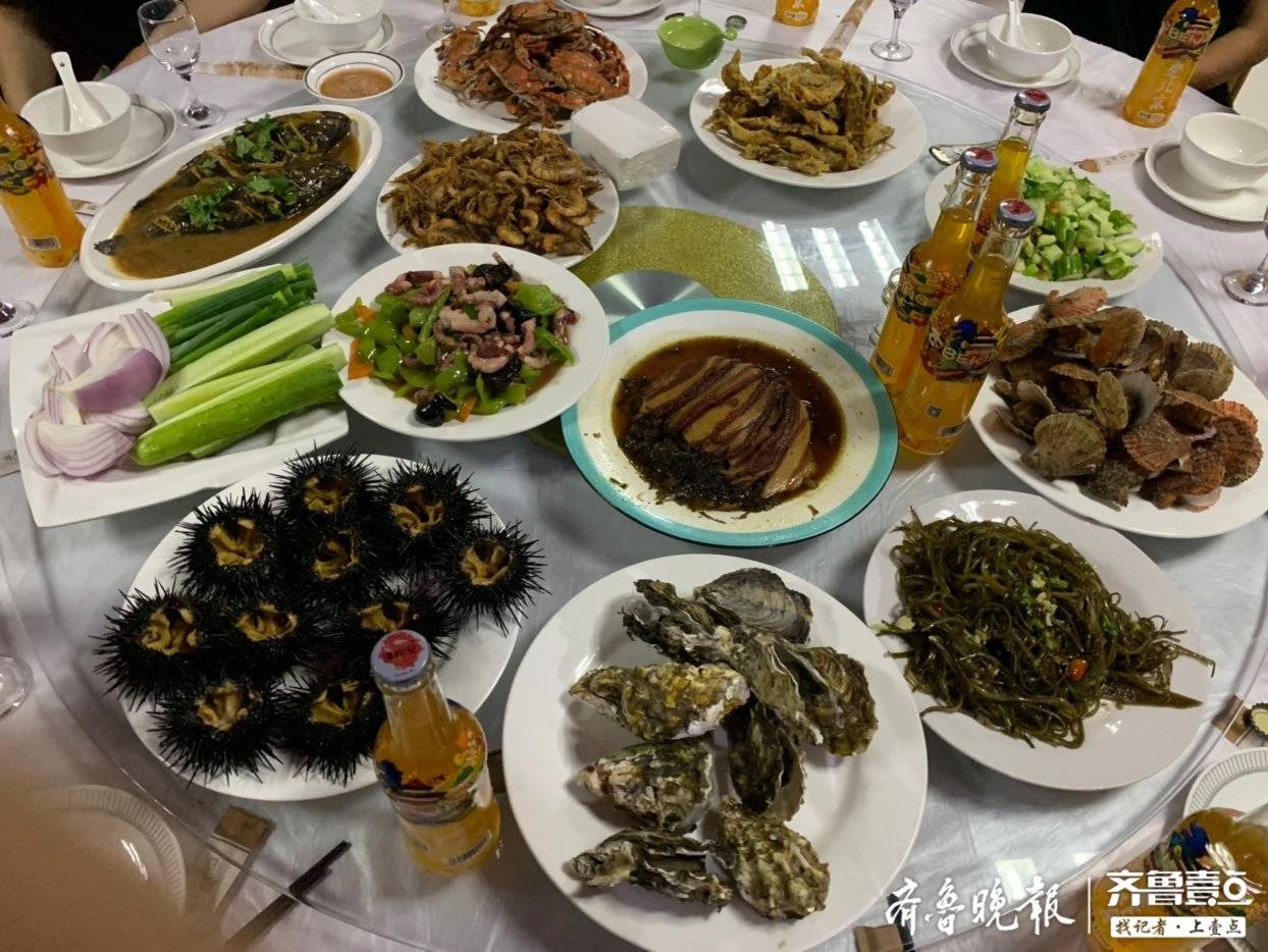 饱完眼福,也要慰劳一下大家的肚子了,到达就餐地点,海鲜盛宴已备好,扇贝、海胆、海参,各种鱼类……应有尽有,当然也少不了我们当地最有名的海带,大家围坐一桌大口朵颐!