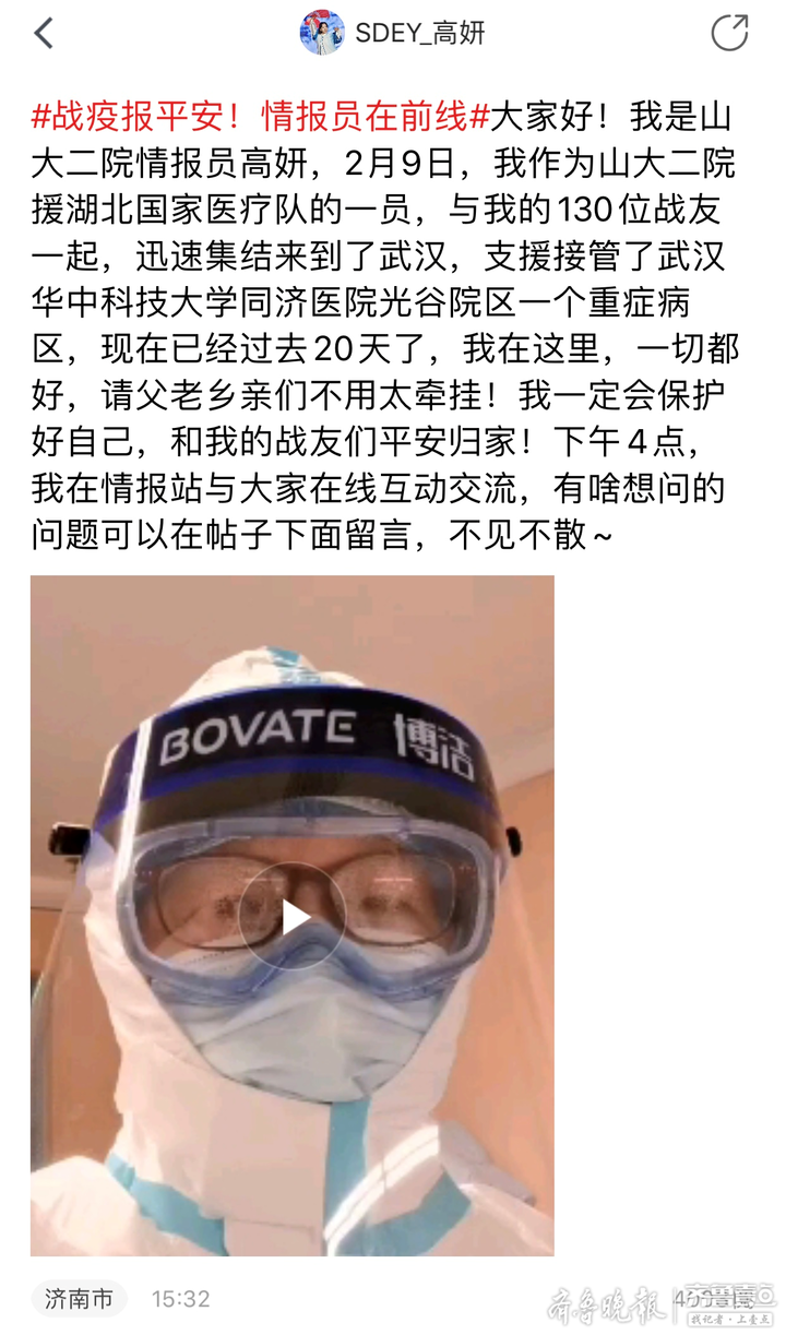 在武汉战疫期间,山大二院情报员高妍通过齐鲁晚报官方客户端齐鲁壹点情报站,与用户实时互动交流,在湖北武汉给山东家乡父老线上报平安。2月9日,山大二院肾移植科病区主管护师、齐鲁晚报·齐鲁壹点情报员高妍,作为山东大学第二医院援湖北国家医疗队队员奔赴一线,在武汉华中科技大学同济医院光谷院区的重症病区参与新冠肺炎救治工作。