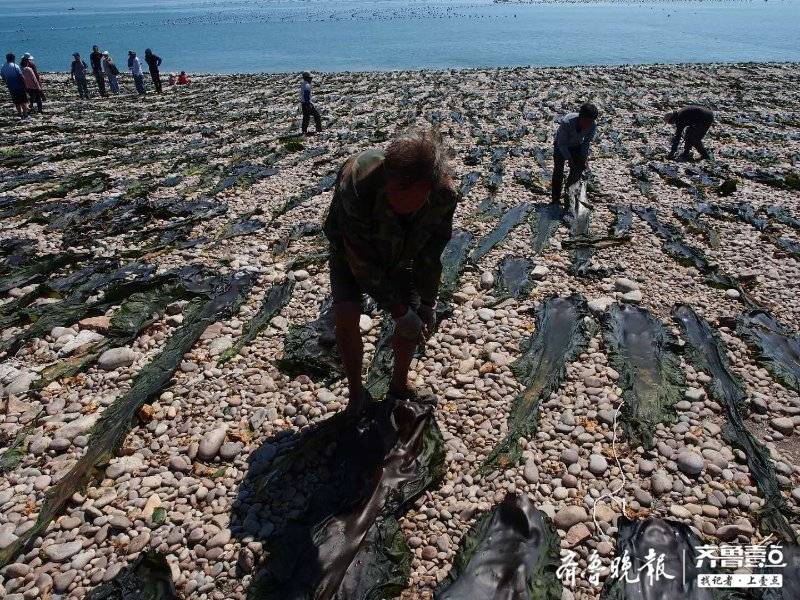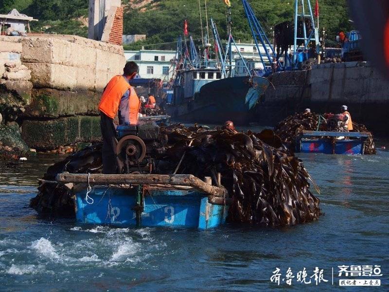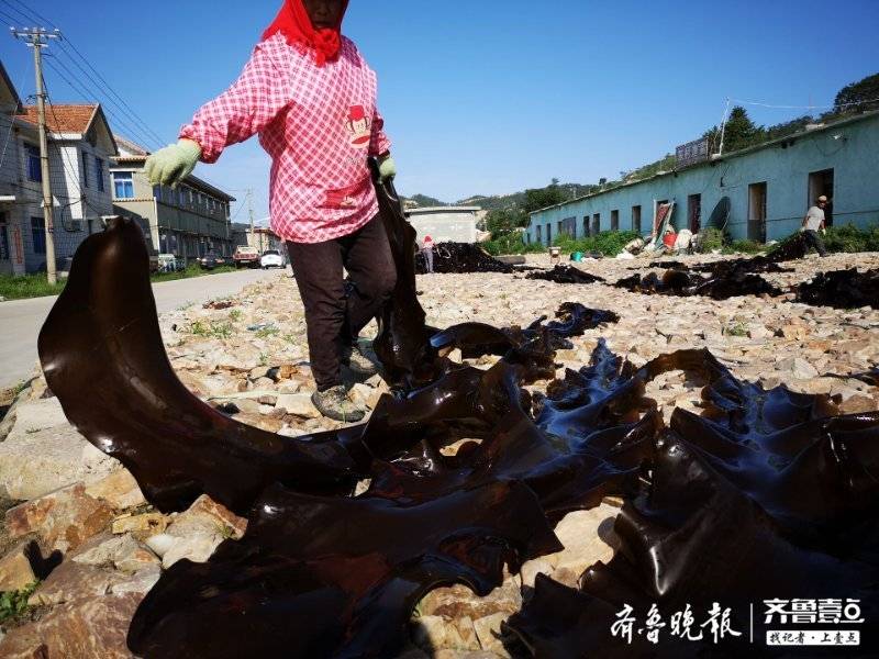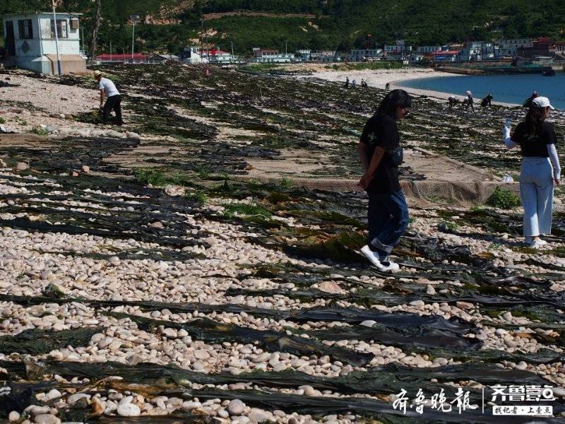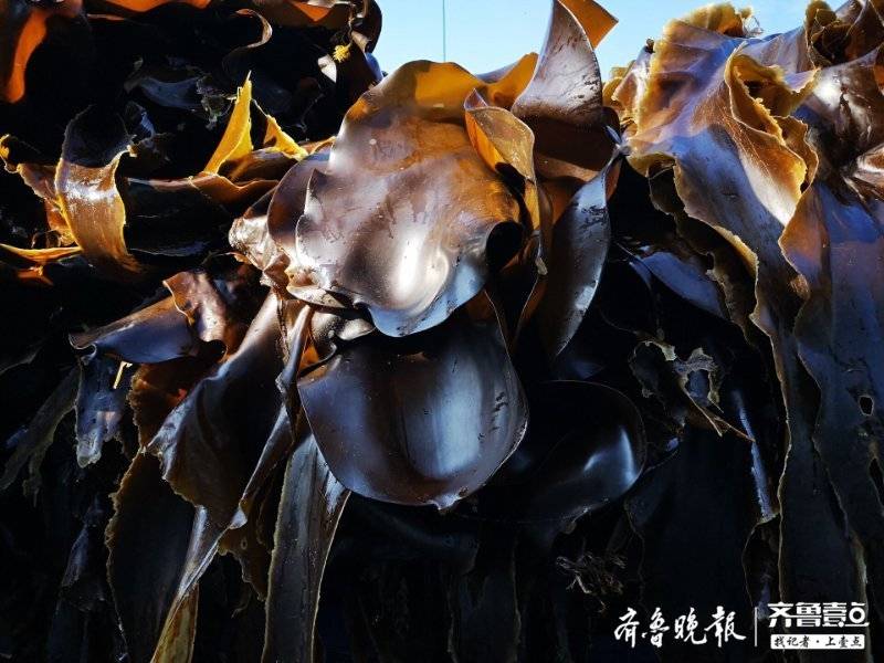 小船排成长列将海带运到码头,起重机将其装卡车运到晾晒场,然后渔民将几米甚至十米长的海带在石滩晾晒。据介绍,近期这种烈日天气阳光和风力都很适合,半天多海带就能晾晒成淡干,吃起来甜滋滋。此时海带成了岛上主角,所有空地都被海带覆盖,十分壮观。