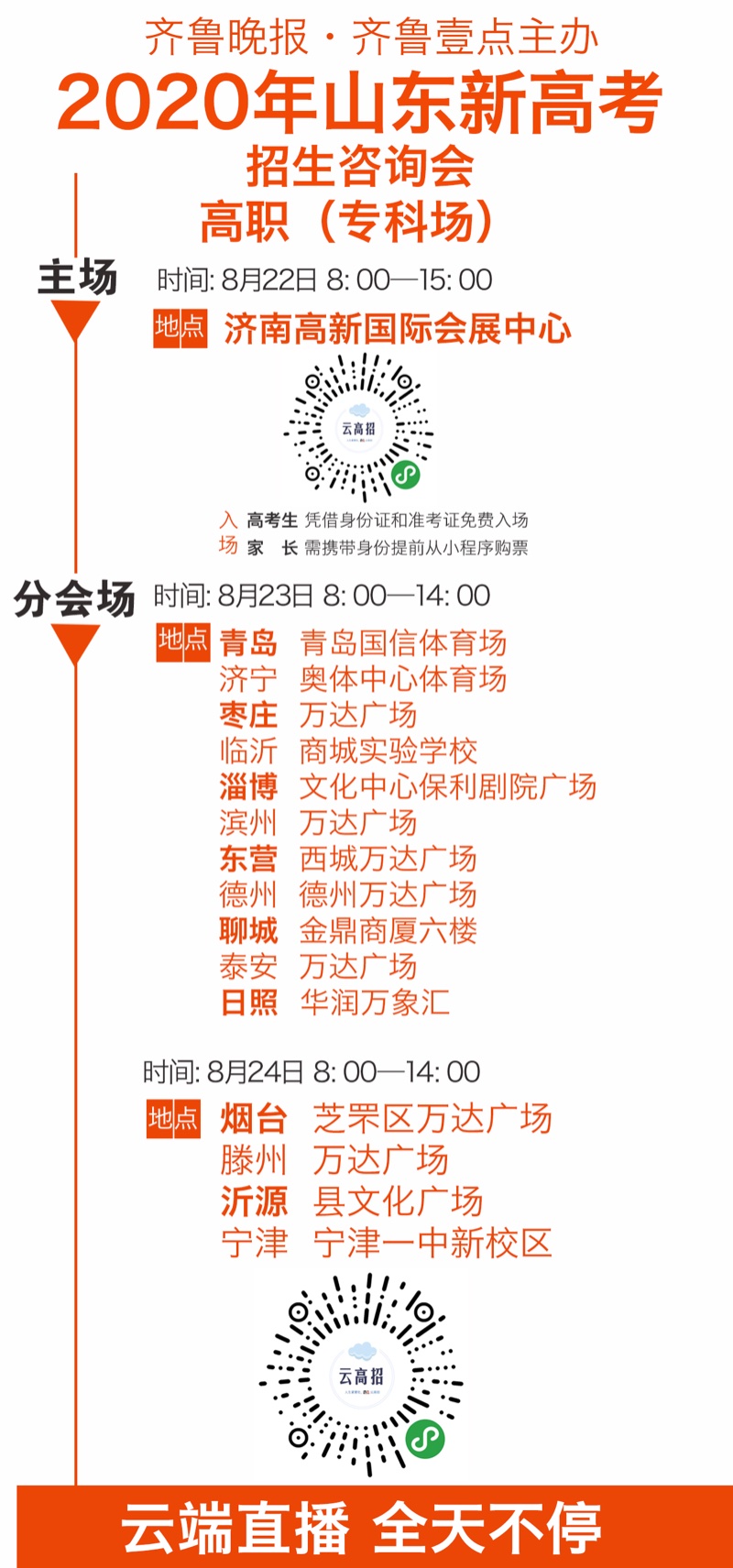 在举办完8月22日的济南综合场之后,根据组委会安排,8月23日,山东高招会高职(专科)场将在青岛(青岛国信体育场)、济宁(济宁市奥体中心体育场)、枣庄(枣庄万达广场)、临沂(临沂商城实验学校)、淄博(文化中心保利剧院广场)、滨州(滨州万达广场)、东营(东营西城万达广场)、德州(德州万达广场)、聊城(聊城市金鼎商厦六楼)、泰安(泰安万达广场)、日照(华润万象汇)举行。
