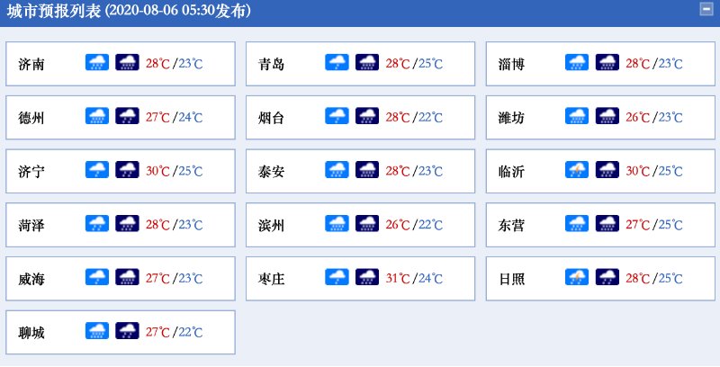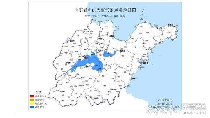 预计8月5日20时至8月6日20时,济南、泰安、淄博、潍坊等市局部地区可能发生山洪灾害(蓝色预警)。包括:平阴县大部、长清区大部、历城区大部、章丘区东部及南部、莱芜区大部、钢城区大部、肥城市北部、岱岳区北部、泰山区北部、新泰市北部、沂源县西部、博山区西部、淄川区西部、青州市大部、临朐县北部、昌乐县中北部。