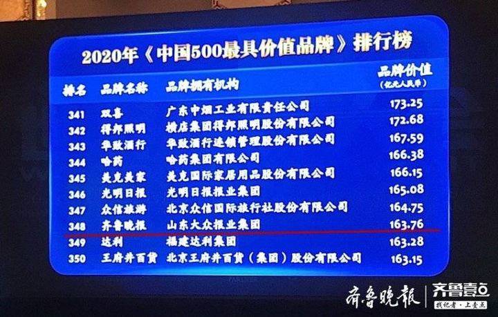 在入围的35个传媒品牌中,CCTV、人民日报、湖南广播影视集团有限公司名列前三。作为山东省内社会影响力最大的都市类媒体品牌,齐鲁晚报连续第17年入选“中国500最具价值品牌”榜单,今年排名第348位,品牌价值达163.76亿元,比2019年增加23.84亿元,逆势增长17.04%。此外,齐鲁晚报兄弟媒体半岛都市报名列第385名。