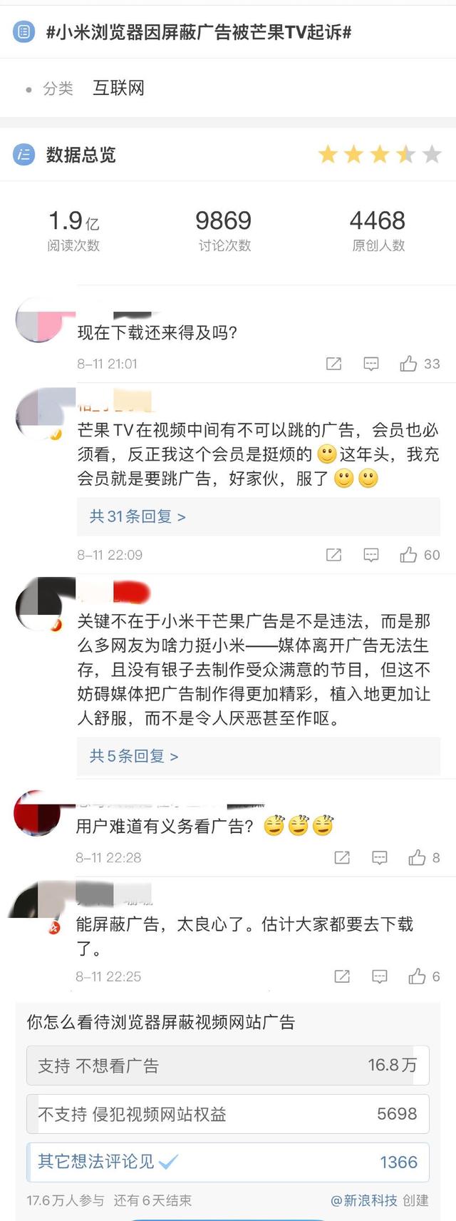 昨天,“小米浏览器因屏蔽广告被芒果TV起诉”登上微博热搜。截至昨晚12点,阅读次数达到1.9亿,讨论次数也逼近1万。