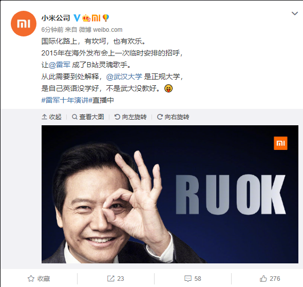 小米公司官微调侃称:“从此需要到处解释,武汉大学是正规大学,是自己英语没学好,不是武大没教好。”