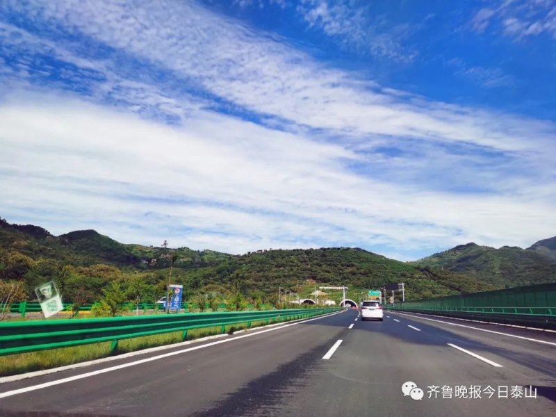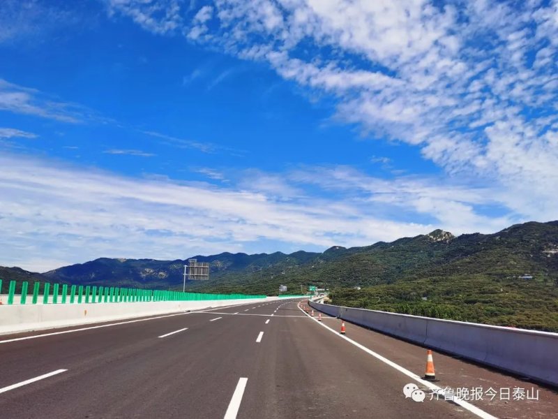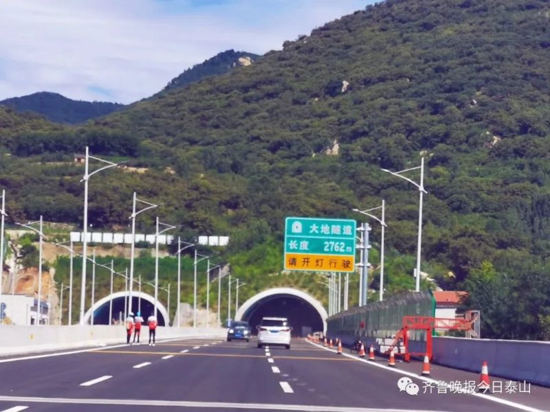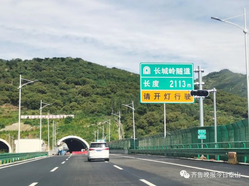 从济泰高速公路的泰山东收费站出发,一路经过麻塔河特大桥、大地隧道、长城岭隧道和柳埠互通等路段,青山绿树与蓝天白云相接,为旅途带来别样的色彩。由于还有机电施工、绿化等未施工完毕,在隧道和高速公路两侧还有一些施工人员在赶工。
