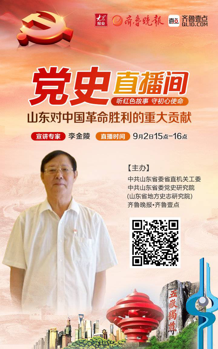 直播第一期海报 宣讲专家:李金陵 云端党课 2020-09-01 4526 齐鲁晚报·齐鲁壹点 “党史直播间” 9月2日开播! 9月3日,中国人民抗日战争胜利纪念日;10月1日,国庆节。为重温中国共产党领导人民进行革命的伟大历史,迎接抗战胜利日、国庆节,齐鲁晚报·齐鲁壹点与中共山东省委省直机关工委、中共山东省委党史研究院(山东省地方史志研究院)联合主办,重磅推出“党史直播间” 。 责任编辑:修伟华