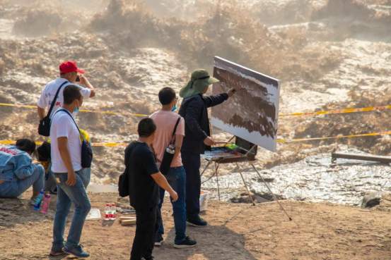 历史老师会穿越时空看见大禹治水,两省通衢、商贸重地的古渡口,还有抗战革命年代一个叫作光未然的青年在这里触发灵感挥笔而成了一首民族生死存亡之际抵御入侵之敌的最强音《黄河大合唱》。美术老师看见壶口瀑布“烟从水底生,未霁彩虹舞,晴空雨蒙蒙,旱天滚惊雷。海立千山飞,十里走蛟龙”壮观美景时心头翻滚的万千激情与感动,化为笔尖的颜料在画布上喷涌渲染,绽放成一幅幅精美的画卷……