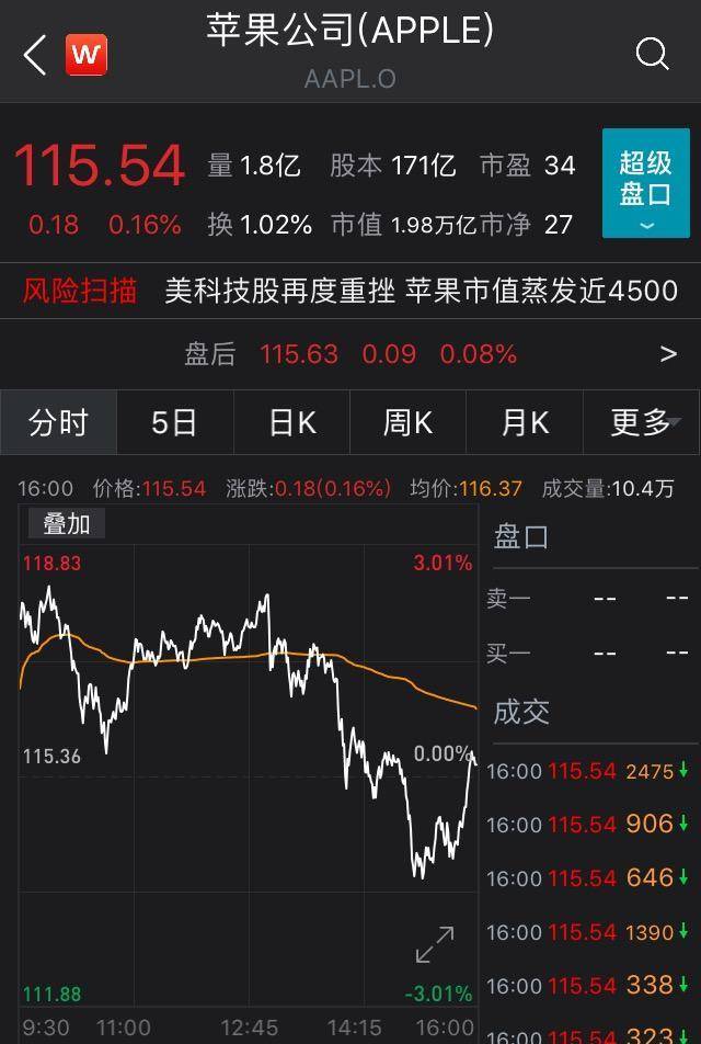 记者注意到,北京时间今天凌晨,苹果股价盘中一度跌幅超过 1%,截至收盘,报 115.54 美元,涨 0.16%。