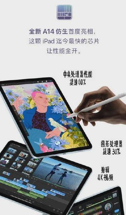 根据苹果介绍,A14仿生处理器是首款采用5nm工艺打造移动设备芯片,在功耗与发热上的表现显然将更为友好,晶体管数量相较7nm芯片增加了近40%,该芯片采用6核心设计,性能提升40%,并采用全新GPU构架,性能提升30%.每秒可运行11万次神经网络运算,是之前的2倍。新iPad Air比上代在机器学习方面提升10倍。
