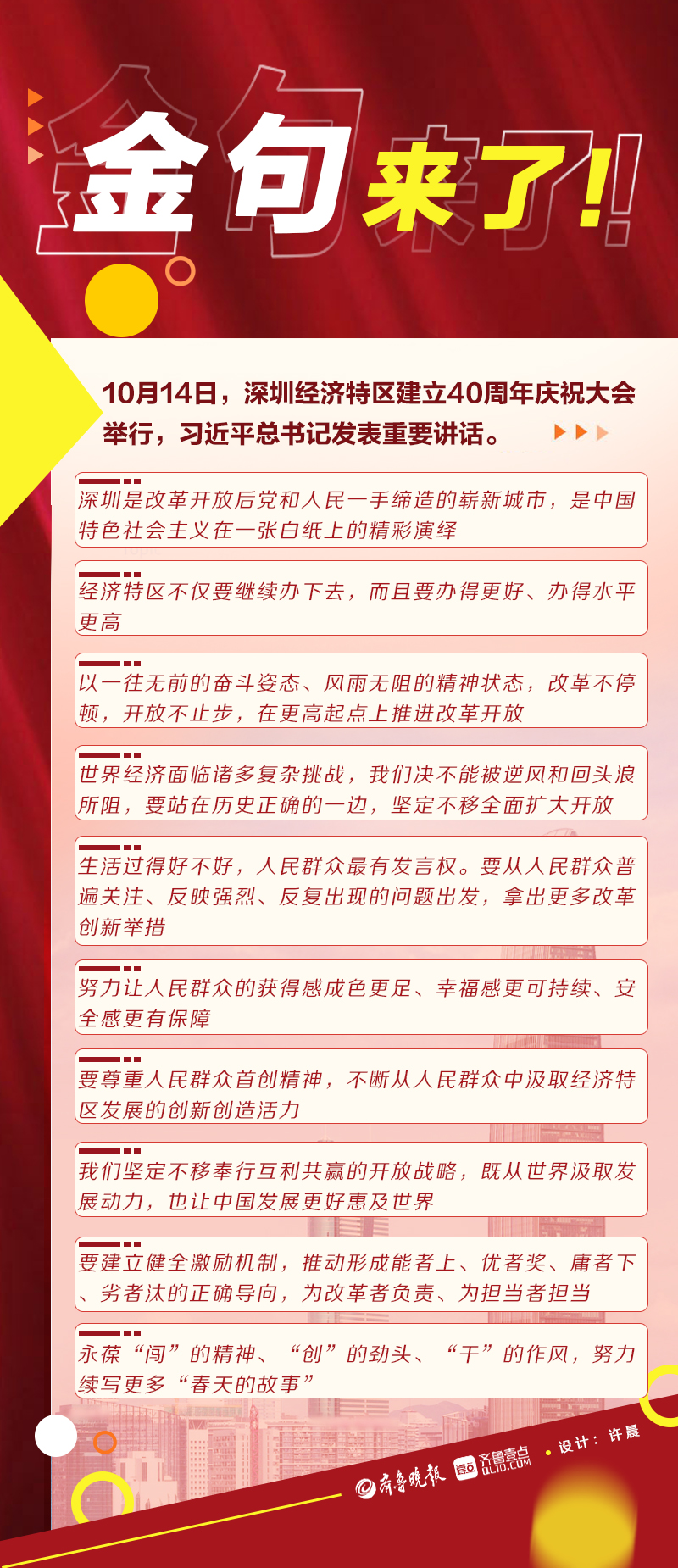 长图壹站|金句来了!习近平:努力续写更多“春天的故事” 长图壹站 2020-10-14 2368 10月14日,深圳经济特区建立40周年庆祝大会举行,习近平总书记发表重要讲话。 (齐鲁晚报·齐鲁壹点 设计 许晨) 责任编辑:曹竹青