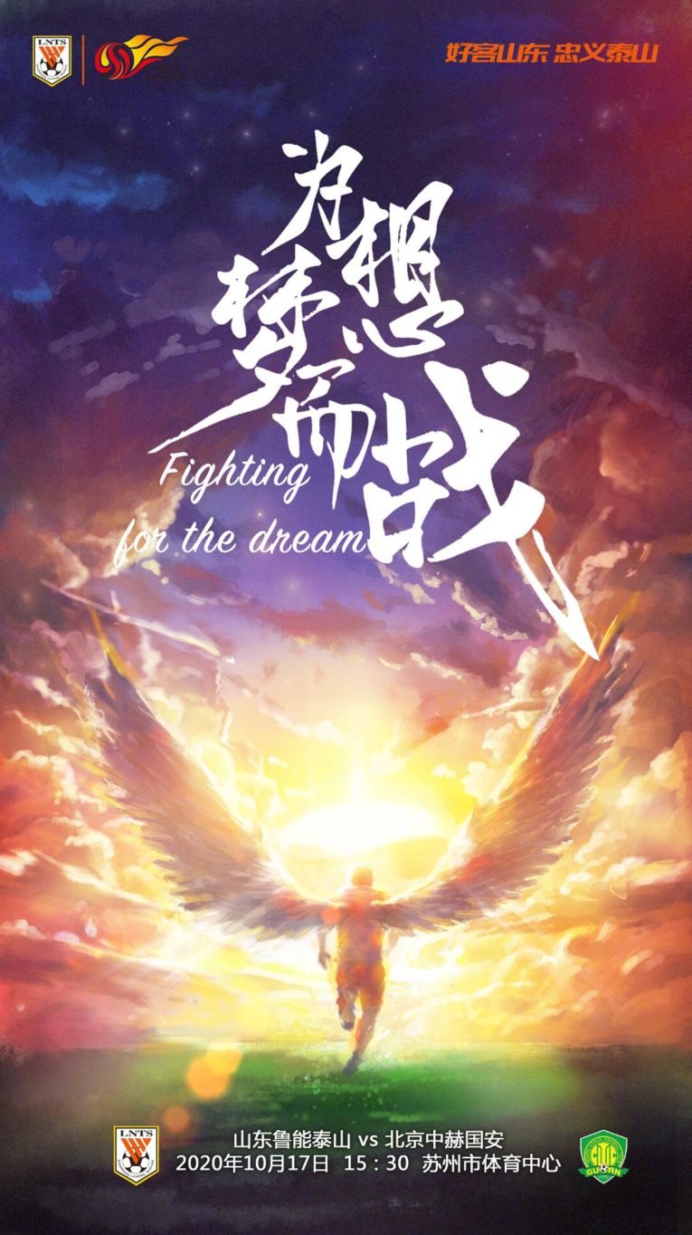 10月17日下午,中超第15轮山东鲁能vs北京国安的比赛即将在苏州市体育中心体育场进行。目前,鲁能发布赛前海报,主题为“为梦想而战”,值得一提的是,这句口号同样出现在球队出征前的誓师大会上。