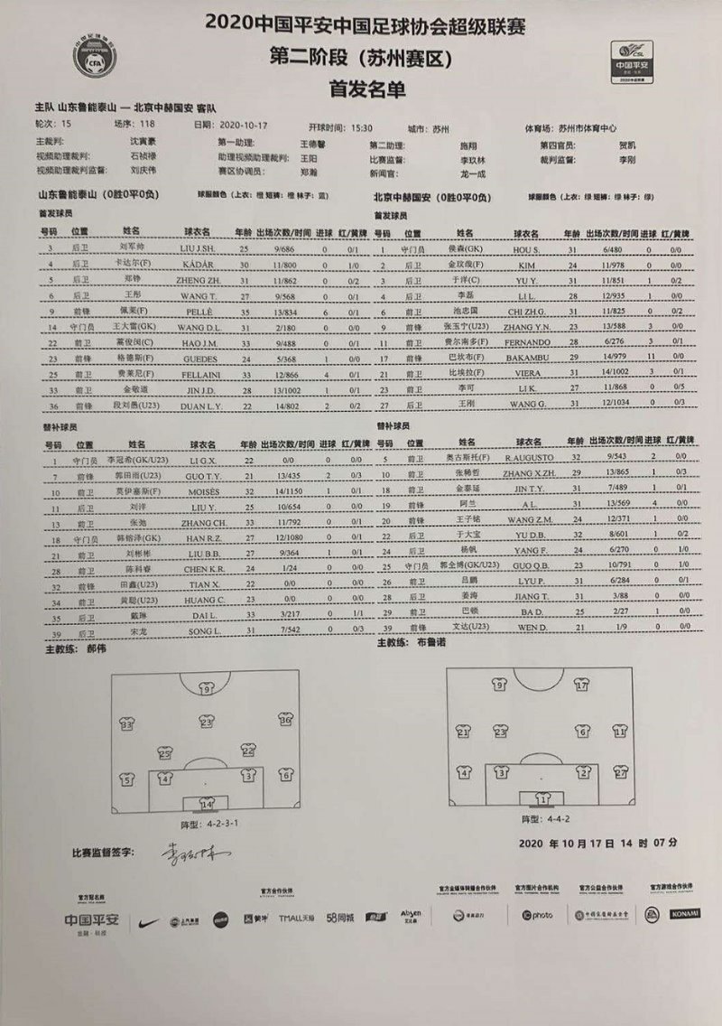 替补:25-郭全博(U23)、18-金泰延、22-于大宝、24-杨帆、28-姜涛、5-奥古斯托、10-张稀哲、26-吕鹏、32-刘国博(U21)、19-阿兰、20-王子铭、29-巴顿