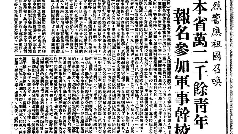 图/山东掀起参军参战热潮,青年踊跃报名参加军事干校,图为《大众日报》报道