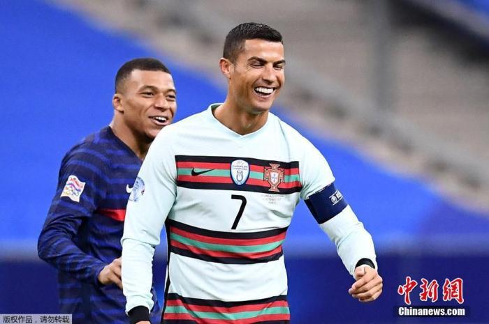 图为 C 罗在葡萄牙与法国队的欧国联比赛中与法国球星姆巴佩互动。