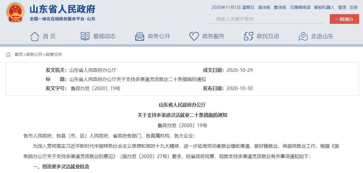 近日,山东省人民政府办公厅发布《关于支持多渠道灵活就业二十条措施的通知》,通过创造更多灵活就业机会、鼓励支持自主创业、优化灵活就业供需匹配等多种方式,进一步拓宽劳动者就业增收渠道,做好稳就业、保居民就业工作。