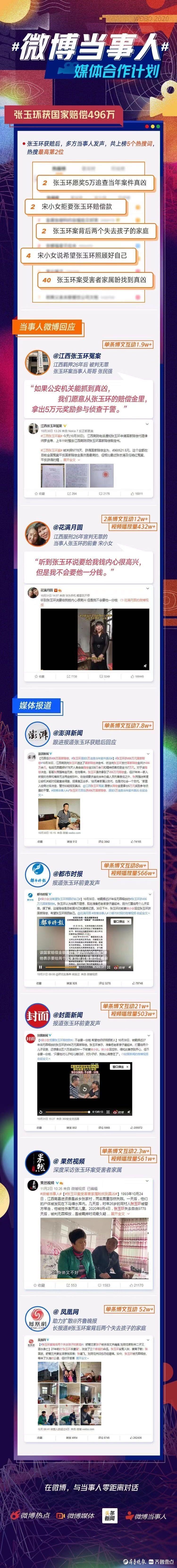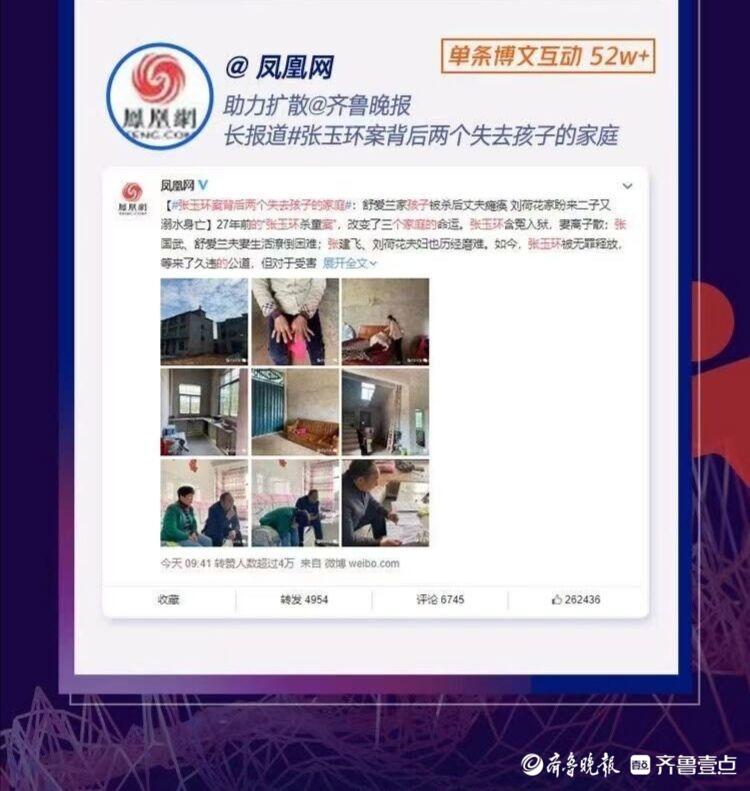 两个遇害孩子家庭的遭遇引发亿万网友的关注,大家在阅读稿件和视频的同时,也纷纷发声,希望关注失去孩子的两个家庭,找到真正的凶手,给他们一个交代。11月2日,“张玉环案背后的两个受害人家庭”文字和视频冲上微博热搜,长时间占据热搜第二。截至11月4日,由果然视频发布的单条博文互动量为2.3多万条,视频播放量561多万次。凤凰网、澎湃新闻、封面新闻等纷纷转发齐鲁晚报•齐鲁壹点的视频和报道,微博话题#张玉环案背后失去两个失去孩子的家庭#的阅读量高达3.3亿,单条博文互动量达52多万条。