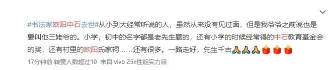 11月5日,首都师范大学在其网站上发布讣告:我国著名学者、教育家、书法家,中央文史馆馆员,中国人民政治协商会议全国委员会第八、九、十、十一、十二届委员,中国书法家协会原顾问、当代书法学科建设重要开拓者欧阳中石先生于11月5日在京逝世,享年93岁。