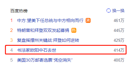 11月5日,北京师范大学发布讣告:欧阳中石先生因病医治无效,于11月5日凌晨3时18分在北京逝世,享年93岁。