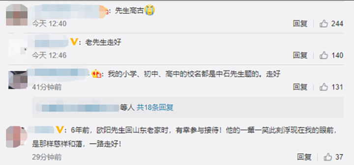 网友纷纷表达对中石先生的缅怀之情,评论区一片“一路走好”“先生千古”的哀悼之声。