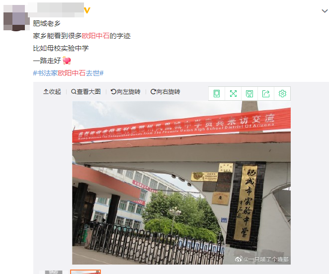 作为他的老乡,有肥城网友晒出图片,说自己母校的名字也是先生所题,以此表达作为老乡的缅怀。