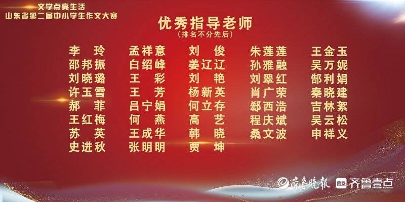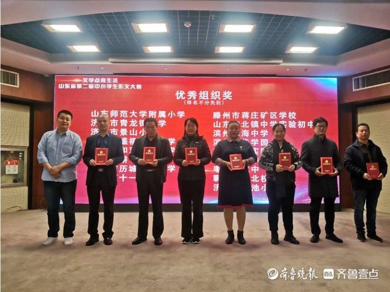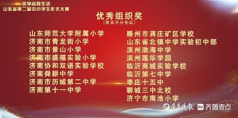 山东省第二届中小学生作文大赛于4月份启动,初赛期间,全省中小学生踊跃投稿,大赛收到近万篇作品,近两千名学子的作品进入决赛,得到了全省众多学校和老师的支持与响应,不少佳作已发表在齐鲁晚报或齐鲁壹点“齐鲁小作家”壹点号。为表彰对大赛给予充分支持的学校和教师,此次颁奖典礼特设置了优秀组织奖、优秀指导老师奖。