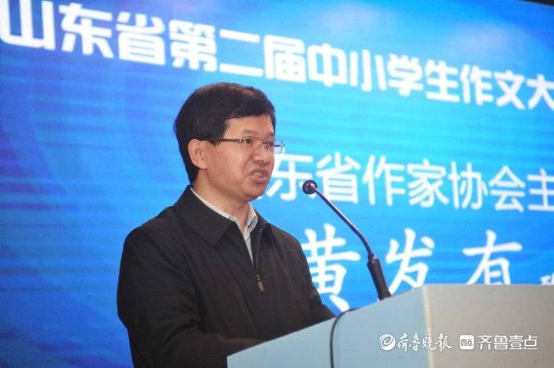 11月7日上午,山东省第二届中小学生作文大赛颁奖典礼在济南举行。山东省作家协会主席黄发有致辞。