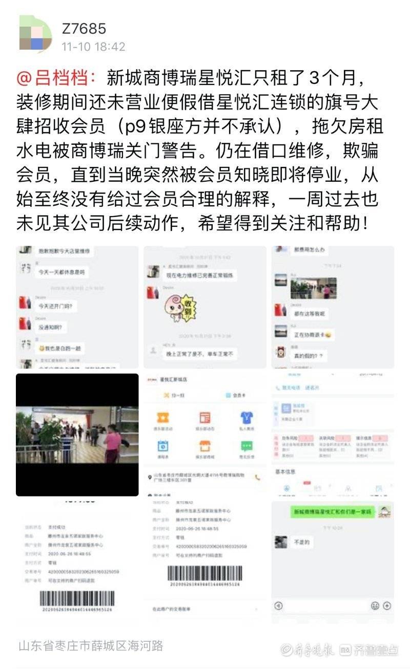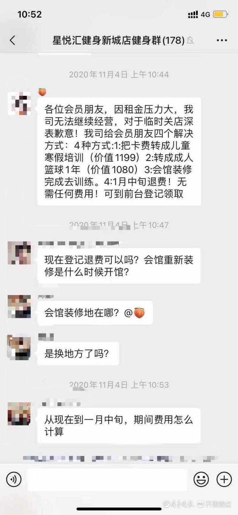 接到壹粉“z7685”张先生在齐鲁晚报官方APP齐鲁壹点情报站的报料后,齐鲁晚报·齐鲁壹点记者第一时间联系到了当事人张先生。张先生告诉记者,他是2020年6月26日在位于枣庄新城钱江路与德仁路交汇处的商博瑞购物中心里的星悦汇健身房办理了一张期限为2年的健身年卡,价值1099元,而后星悦汇健身房7月初才开业。而就在11月初,张先生突然被告知健身房停业倒闭了,“很突然,也没有人告知,就健身房的前台在群里面发了个通知,说会退钱,但是目前我们维权群里面200多人,没有一个收到退款。”