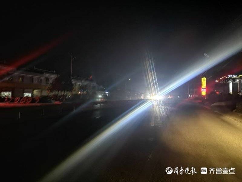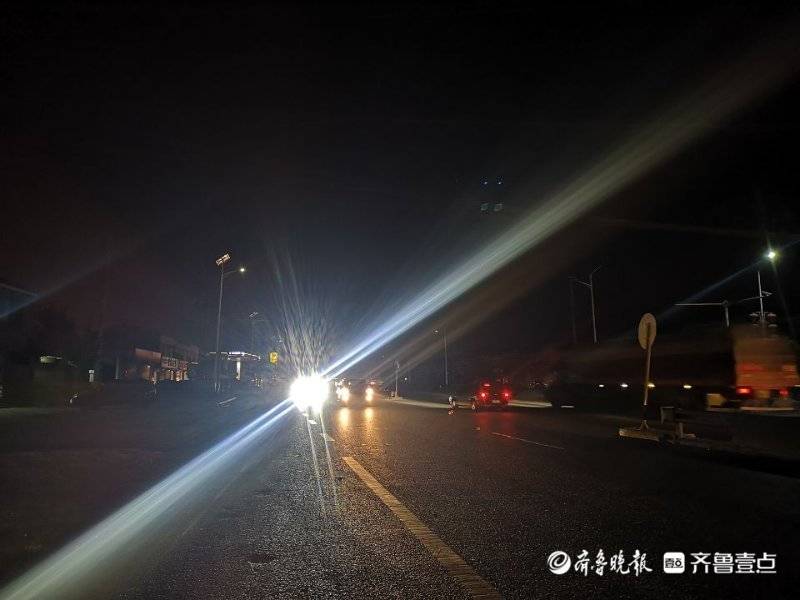 吴女士反映的情况是否如她所言?16日下午6点,齐鲁晚报•齐鲁壹点记者驾车从光明大道经店韩路转向驶入枣曹路, 记者看到道路两侧的路灯确实处于“罢工”状态,途中车流较大,来往车辆大车居多,车速较快,道路两侧行人也不在少数,许多村口处也没有设置人行信号灯,沿途中与对向驶来开着远光灯的车辆交汇时,几乎看不清前方道路情况。记者注意到,从店韩路与枣曹路的交界处到南园立交桥全程共计13公里的路程,路灯正常工作的大约不到2公里。