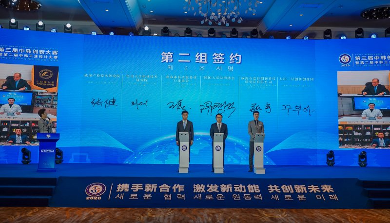 11月20日,第三届中韩创新大赛暨第二届中韩工业设计大赛颁奖活动在威海经区和韩国首尔同步举行,两方会场分别为中韩两国获奖代表颁奖,并举行了中韩科技合作远程线上电子签约仪式、中韩高校创新创业共同体启动仪式及中韩人工智能创新合作论坛。威海市科技服务机构与首尔会场、线上嘉宾三方互动,电子签约7份科技合作协议和30份科技企业孵化器入孵协议。