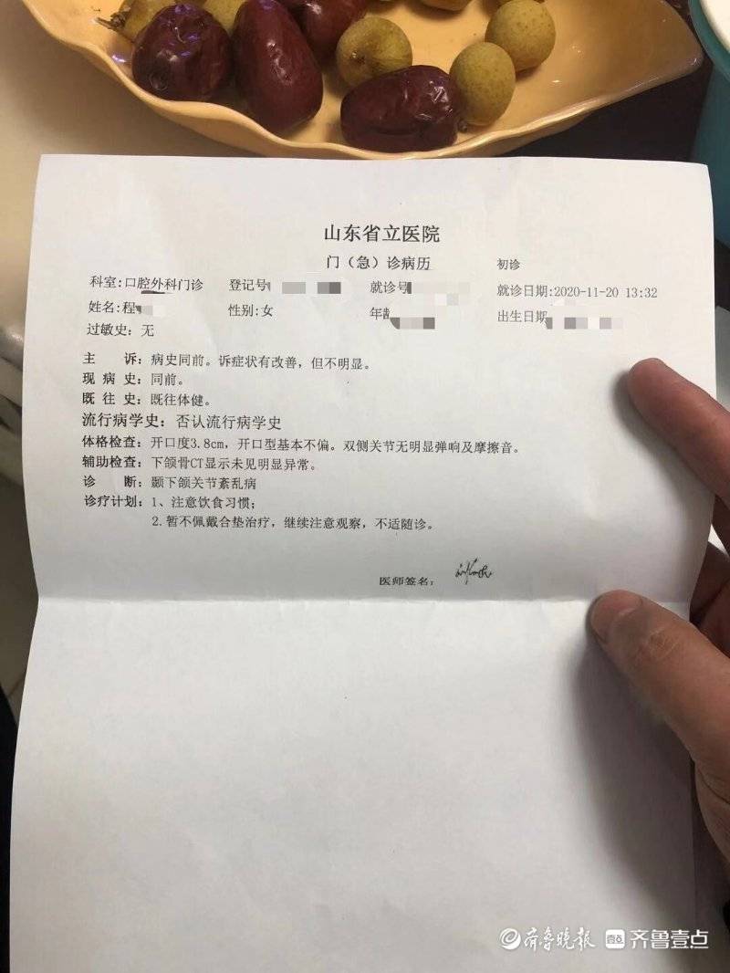 3个月前,齐鲁晚报·齐鲁壹点报道了《一颗智齿引纠纷,枣庄女子拔牙俩月“不敢笑”,一查才知伤到关节》一文,当事人程女士于2020年6月初在枣庄市中区人民医院在没有拍片的情况下拔了一颗阻生齿,这一拔不要紧,之后接连患上了干槽症和颞下颌关节紊乱。而作为涉事方的枣庄市中区人民医院却表示“患者先治疗,治疗结束再沟通”,如今5个月过去了,程女士的情况依然没有明显改善,也未等到医院给出的合理处理方法。