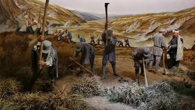 随后,八路军三五九旅在旅长王震的率领下,在南泥湾开展了著名的大生产运动。南泥湾是延安精神的发源地,其自力更生,奋发图强的精神内核,激励着一代又一代中华儿女战胜困难,夺取胜利。没有粮食,就跋山涉水到百里外去背;没有菜吃,就挖野菜,打野兽;没有工具,就去捡弹片,锯铁轨,自己动手打铁。在热火朝天的垦荒竞赛中,开荒纪录不断被刷新。