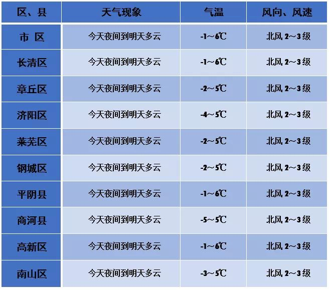 12月1日阴,傍晚到夜间有小雨雪,降水概率70%,北风2~3级,最低气温济阳区、商河县-3℃左右,市区及其它区县1℃左右,最高气温6℃左右。