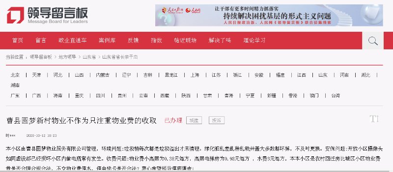 近日,菏泽一网友向山东省省长李干杰留言反映小区物业收费、安保等问题