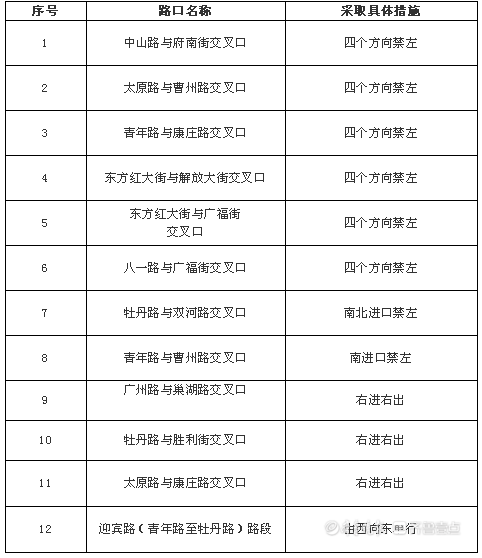 其中,中山路与府南街交叉口、太原路与曹州路交叉口、青年路与康庄路交叉口、东方红大街与解放大街交叉口、东方红大街与广福街交叉口、八一路与广福街交叉口等6个路口四个方向全面实行机动车禁止左转交通管制措施,即东西进口禁止左转车辆向南北方向通行、南北进口禁止左转车辆向东西方向通行。同时,非机动车实行二次过街交通管制措施,路口内设置非机动车禁驶区域,完善非机动车二次过街待行区。