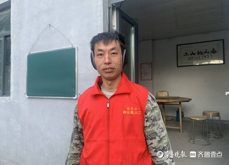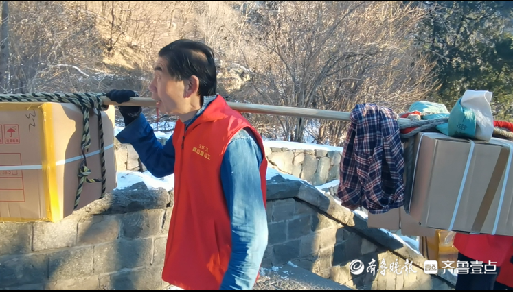 冬天天黑得早,为了保证每天能上山两趟运送货物,挑山工们六点多就早早地起床了。装好货物,瞅了眼表,已经七点十八分,王怀玉亮了亮嗓子喊了声屋里的同伴,徐西永与梁思臣边戴手套,边走了出来。泰山脚下温度-3℃,山上要比山脚低五六摄氏度,但是他们都只穿了一件秋衣和一件褂子,外面披一件印有“泰山挑山工”字样的红色马甲。王怀玉并没有将多拿的那件棉袄穿在身上,而是系在了扁担上,“不冷,你们往上爬就知道了”。